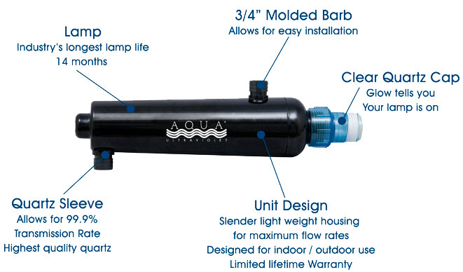 The Advantage Series is ideal for small ponds, aquariums, and water features. Advantage UV’s are slim, lightweight units designed for maximum UV effectiveness. Aqua Ultraviolet UV’s will clear your water in 3 to 5 days sometimes overnight and keep it that way. Performance is guaranteed when sized, installed and operated according to our instructions.