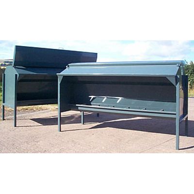 10 feet wide single-sided. They have a flap on the lid to guide the food into the hopper so there is no spillage when using an 8ft wide bucket. Adjustable slides to regulate the flow of feed into the trough. 1 tonne capacity. Creep gates available. Also available: 6 ft and 8 ft galvanised single and double-sided barley beef feeders with adjustable legs and painted single-sided barley beef feeders.