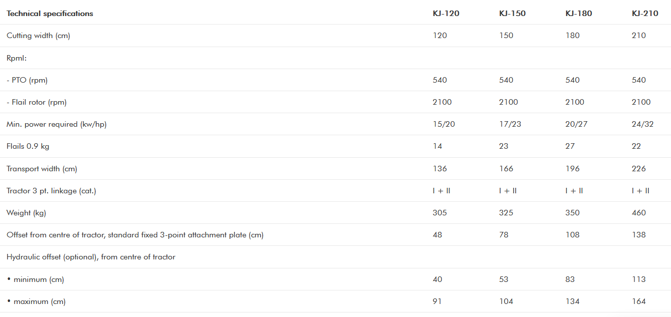 The KJ flail mower is equipped with flails weighing 0.9kg (2lbs); the rear roller is positioned in such a way that the flails clean the rear roller.
