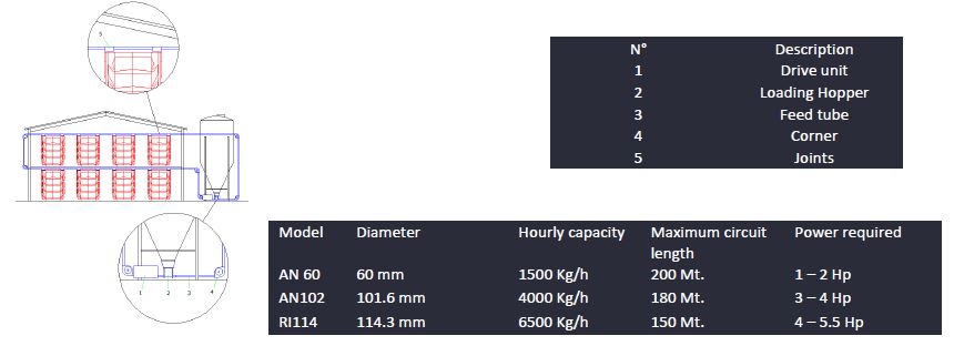 Falcon chain conveyors, thanks to their great flexibility, can navigate often winding paths that are difficult to achieve with traditional screw conveyor systems. In the most complete configuration, it is possible to reach systems with a maximum capacity of 12 tons/hour, with very low motor power ranging from 1.5 to 4 HP per circuit. With the same conveyor, it is possible to connect one or more pickup silos and distribute the feed across one or two levels.