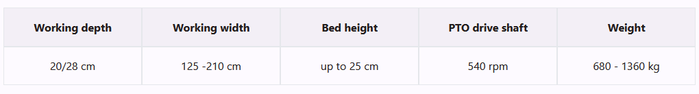 The Massano bed former is designed to set up seed or plant beds in a single pass using its dual-rotor system. The front rotor loosens the soil deeply, while the rear rotor, rotating opposite to the direction of travel, finely pulverizes and lightly compacts the top layer of soil.