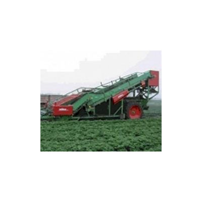 This bed harvester is suitable for harvesting seedlings. The tractor`s lifting device is used to set the height. The soil and plants enter the screening belt via the movable blade. This sieving belt rotates upwards at the same speed as the driving speed to hold the bed together. Vibrators under the sieving belt loosen the bed. At the rear of the harvester, the plants are picked up manually and put into boxes. At the top is a box platform for the empty boxes. The planter includes a steerable wheel axle for sharp headland manoeuvring. The whole unit is controlled via a push-button box in the tractor.