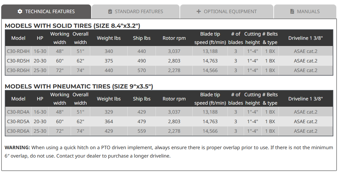 - Heavy duty shielded PTO shaft (1 3/8″ ASAE cat. 2)