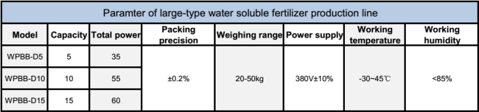 The belt-scale-batching water soluble fertilizer line is technologically advanced and highly automated, which allows a mass production, accurate packaging and easy operation. In the design, the labor intensity for fertilizer feeding has been fully considered. The machine, with the resistance to corrosion, has a long service life. Being microcomputer-controlled, it also saves manpower. The equipment has a high cost performance, thus customers can change formula as required.