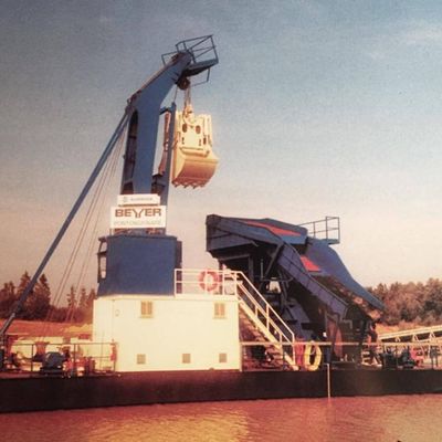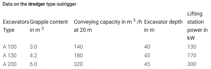 The boom excavator is used for small to medium-sized sand and gravel deposits. The boom system consists of a rocking boom, which is constructed on a closed pontoon system. There is also a fixed wind on the pontoon. The holding and closing ropes coming from the winch run, on which the gripper is mounted either as a hydraulic motor gripper or as a rope gripper. The gripper works in an excavator hole within the pontoon system.