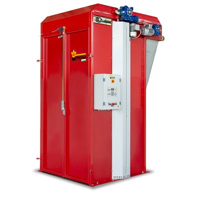 Vertical Big Bales Crusher with soil discharge into a filler hopper or a soil mixer. The peat bale is lifted up by a platform and the soil is scraped off from the top of the bale. All motors are driven by inverter, control panel, acoustic signals, soil detector sensor for an automatic start/stop of the machine.
