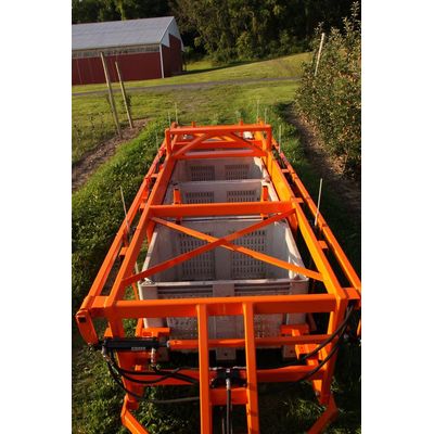 The Bin Trailer provides the capability to move multiple boxes both in and out of the rows. The clamp style trailer straddles the boxes and retractable forks slide under the box allowing vertical lifting. The Bin Trailer can easily be used in conjunction with the Harvest Platform. By using the Bin Trailer, empty boxes can be brought to the rear storage trailer of the Harvest Platform and full boxes can be retrieved from rows. The air suspension in the Bin Trailer, allows for smooth transportation of the fruit in any orchard.
