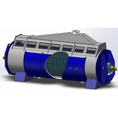 The complete rotary sludge dryer contains screw conveyor, disc dryer, de-duster, vapor condenser and washing scrubber. Wet sludge from screw press sludge dehydrator usually contains 70-80% moisture. Sludge is continuously fed by the screw conveyor to the rotary sludge dryer where it will be heated. The moisture in the material vaporizes and drawn by air blower.