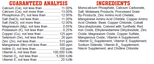 Feed to cattle and horses. Do not feed additional salt or other mineral containing salt. CATTLE — Feed free choice 2 to 4 ounces per head per day. Supply one block per 10 to 20 head. Locate in easy access areas, such as pathways or watering and loafing areas. HORSES — Feed free choice 2 to 4 ounces per head per day. NOTICE: This product contains no prohibited animal by-products in accordance with FDA Regulation 21 CFR 589.2000. This manufacturing facility does not handle, store or use any prohibited animal by-products.
