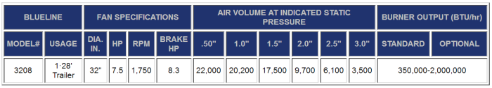 Blueline Dryer Model 3208 is a quiet high speed curer for 7 to 10 tons on one 28` peanut trailer. Almost twice the airflow of typical single trailer dryers with only 20% more horsepower. Blueline peanut dryers are simple in design and operation, energy-efficient and trouble-free. In addition to peanut dryers and peanut trailer dryers, Blueline offers dryers for pecans, onions and other crops. Tailoring fan and burner characteristics to the optimum curing parameters for specific crops can put more profit into your operation.