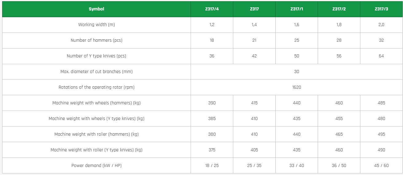 The machine can be equipped with Y type knives or hammers. The Y knives are designed for mowing the grass, while the flail hammers are used for shredding small branches and shrubs.