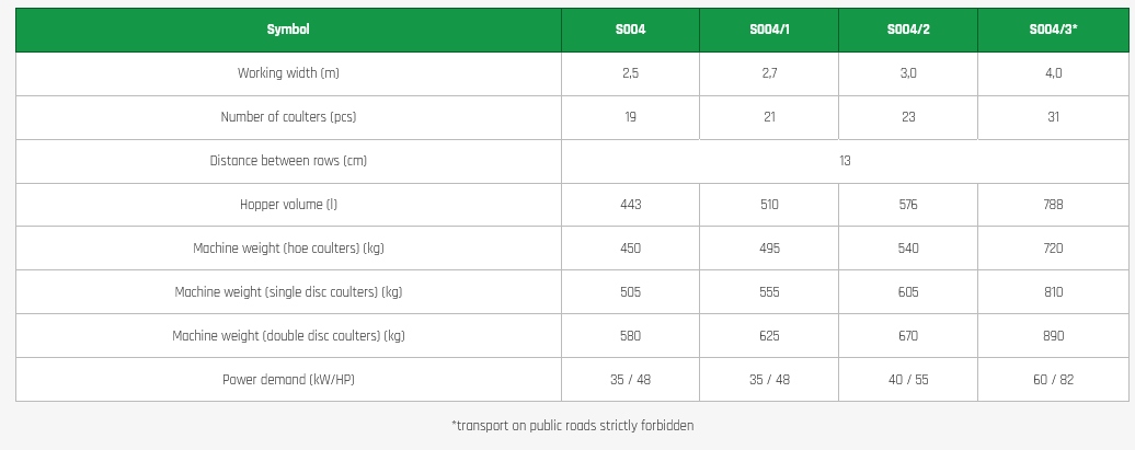 The seed hopper with a "V" shaped bottom ensures complete emptying of the seed material. The drive of the sowing units is via a drive wheels and a set of chain transmissions and a 60-position continuously variable transmission.