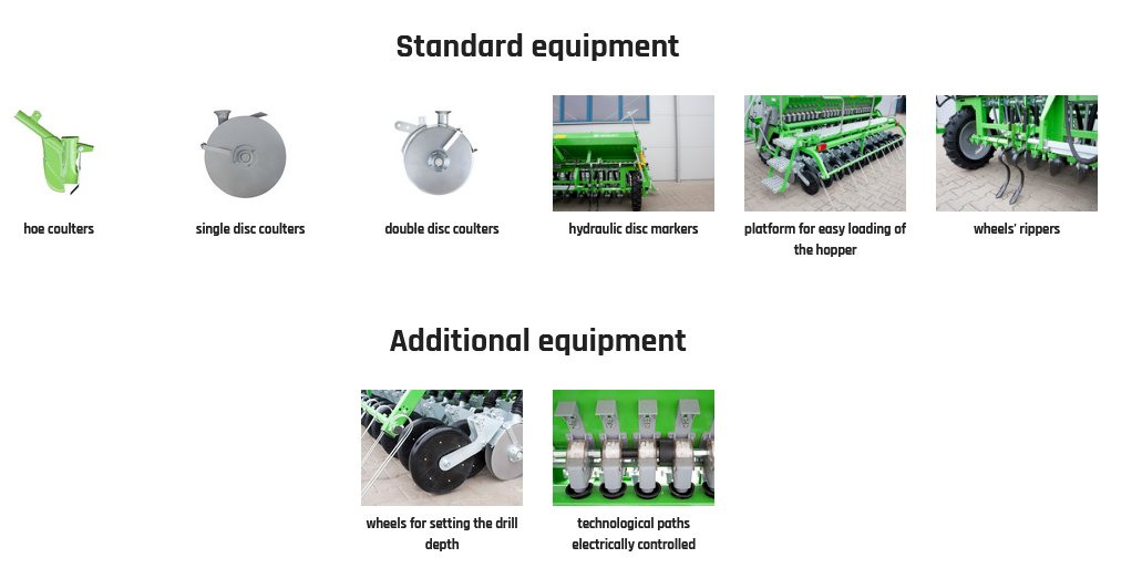 A seed drill depending on the soil conditions, can be equipped with hoe coulters, single disc coulters or double disc coulters.