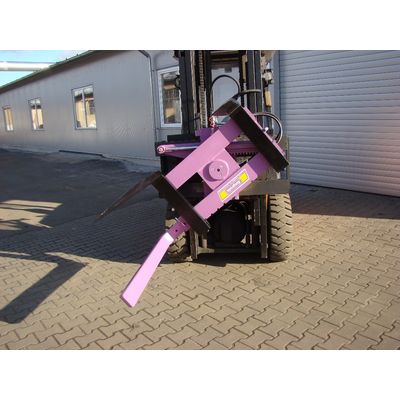 Box turning equipment for fork lift trucks is used to empty box-palettes. Equipped with one supporting arm. We can also perform additional arm, which provide “left” rounds.