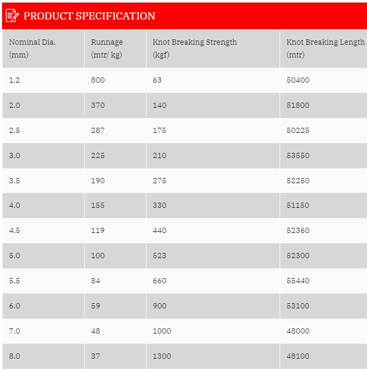 Ideal combination of abrasion resistance and knot breaking strength, Bonded filaments prevent mud ingress, Mesh size stability and long life, Compact construction netting ensures improved performance even in severe conditions, Manufactured from specialized raw material, Thermo-stabilized for dimensional uniformity and stability of the mesh, Unique identification: green + 2 orange tracer yarns in the cover.