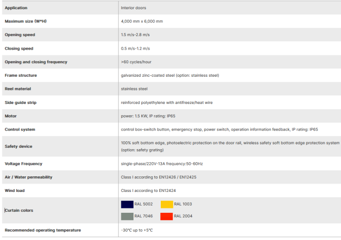 Automatic and fast door cycle improves logistics efficiency. Tight seal and insulated curtain reduce air flow, energy transmission to save energy, and protect against bad weather and dust-free. Flexible curtain without rigid elements avoids injuries and damages, which is safe for personnel and/or equipment. Self-reinserting door curtain avoids down-time.