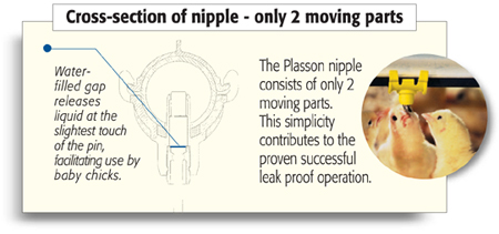 The Plasson nipple provides the maximum amount of water at the slightest touch. The nipple responds at any angle. Even day old chicks, at the most critical stage of growth, can easily activate the nipple.
