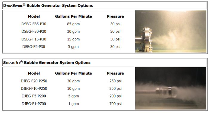 Both DynaSwirl and  StratoJet bubble generators are scalable and versatile, they can be made of different materials and can be custom designed and fabricated to meet the customers specific application requirements. The bubble generators also allow production of bubble sizes ranging from nano to millimeters depending on the configurations and applications. Selection of sizes and pump capacities enables these generators to produce from small to very large flow rates and to spread over a larger area.