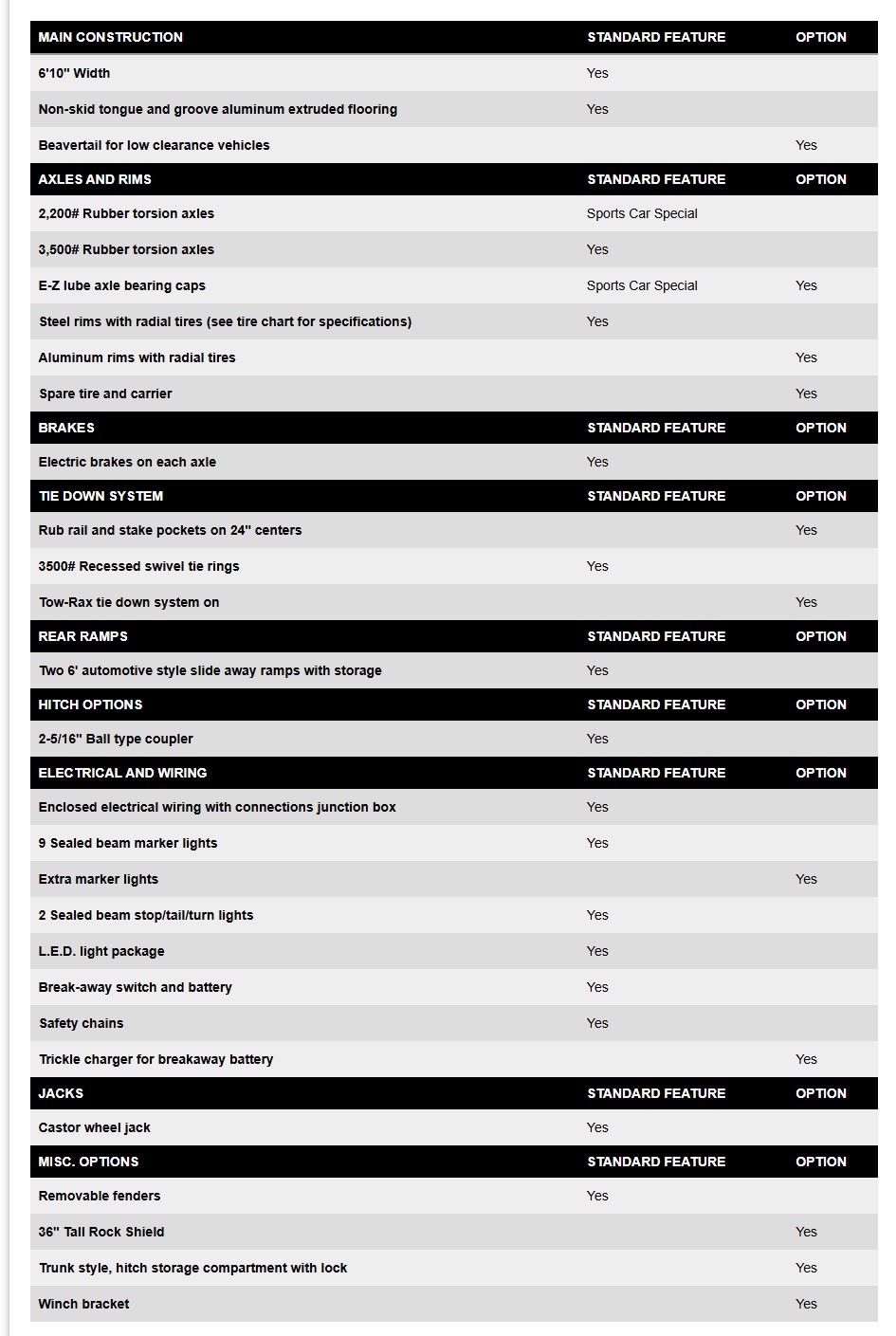 The "Standard Features & Options" tab will help you get started choosing the features for your Bumper Pull Open Automotive Aluminum Trailers. We have a knowledgeable staff on hand that can help you begin the building process of your custom built trailers today.