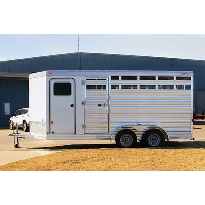 The Express STC 616 bumper pull stock combo trailer features a well-built rugged interior that meets the demands of transporting livestock and horses both. The trailer includes a full swing center gate with heavy-duty slam latch, aluminum wheels and a 4` straight wall tack room.