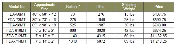 The Kolaps-A-Tank has 6 sizes and can be handled easily by one person, and yet holds from 73 to 1340 gallons! It can be filled and emptied in minutes with a centrifugal force pump or drained by gravity flow. Convenient to fill and drain with 10"diameter flexible sleeve on top for filling and 1 1/2" gate valve mounted on 8" PVC extension pipe for easy draining. Easy to store, even the largest Kolaps-A-Tank can be folded up and stored in an 19"x19"x19" carton.