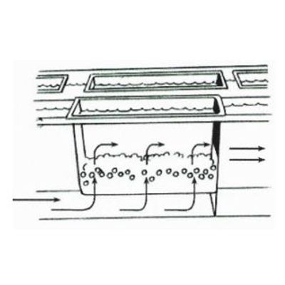 This hatching devise consist of individual serial trays with a tight fit inside a shallow trough. Trays are perforated in the bottom and the top of the one side turning away from the water inlet. In combination with a tight fit to the sides and the bottom of the trough and correct dimensions, this design result in an upwelling waterflow.