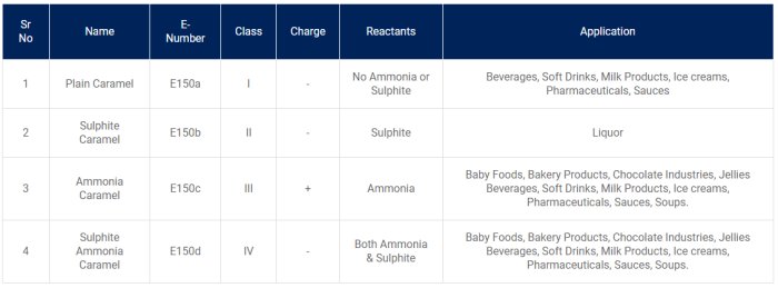 Caramel is prepared by the controlled heating of food-grade carbohydrates with or without added chemical catalysts. Caramel is water-soluble in powder as well as in liquid form. Caramel color has four (4) classes, depending on net ionic charge and reactants used in preparation: