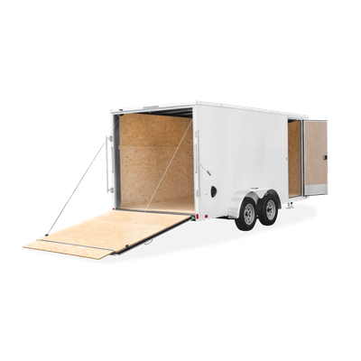 The trailer’s VHB bonded, screwless .030 aluminum exterior delivers a sleek, professional finish with superior strength. ATP caps and a 24” ATP stone guard provide added front-end protection. Choose between a rear ramp door with a 12” extension or barn-style double doors for loading flexibility. The SOLIDOOR™ side entry, built with CNC precision-cut aluminum extrusions and a laminated core, offers secure access. Sidewall airflow vents promote ventilation, while radial tires and drop spring axles with easy-lube hubs ensure a smooth ride. Integrated reverse lights on brake axle models add additional illumination and safety during backing maneuvers.