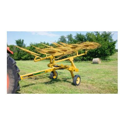 4. Transport made easy! Flat-folding 5 rake wheels reduce height; center folding toolbars reduce width. Hydraulic locks secure the frame. Dual hydraulic lift cylinders. Greaseable, tapered roller bearings on both the rake wheels and transport wheels.