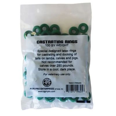 Castrating bands/rings are applied with a castrating band applicator for tail docking or castration. Made of premium Malaysian latex. Excellent pressure ratings and retention levels. 100 by weight per bag. Store in a cool, dark place.