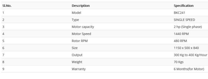 Salient Features: It is operated by 2 Hp single phase electric motor. Superior quality blades provided for uniform cutting and long life. Low Power consumption.