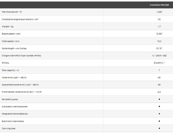 - Kickback sensor with electronic start-up: this device instantly triggers an electric chain brake in the event of a fall or kickback, and is 8 times more sensitive than a combustion enfine-operated chainsaw chain brake.
