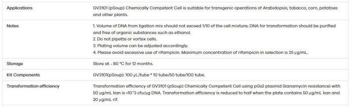 The genotype of GV3101 (pSoup) Chemically Competent Cell is C58 (rif R) Ti pMP90 (pTiC58DT-DNA) (gent R) Nopaline (pSoup-tet R). Background of GV3101 (pSoup) strain is C58. It contains rifampicin resistant gene (rif) in nuclear genes as screening label. GV3101 carries nopaline type Ti plasmid pMP90 (pTiC58DT-DNA) to facilitate transformation. Ti plasmid pMP90 (pTiC58DT-DNA) contains vir gene, which is essential for insertion of T-DNA into plant genome. Ti plasmid pMP90 (pTiC58DT-DNA) is disabled to transfer its own T-DNA but enabled to transfer foreign binary vector T-DNA. pMP90 (pTiC58DT-DNA) Ti plasmid contains gentamicin resistance gene.The pSoup plasmid helps the pGreen, 62SK, pGs2 series plasmids to replicate in Agrobacterium.