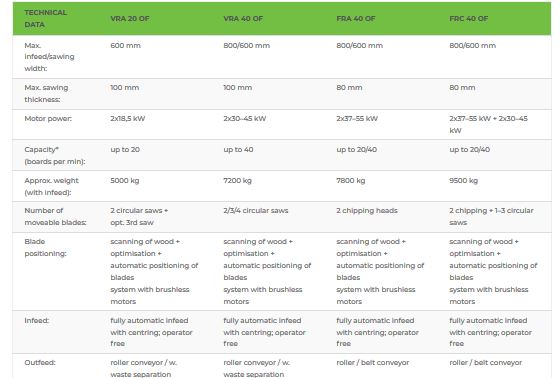 Fast, optimised, automatic – designed for high production log sawing lines and for customers looking to decrease labour costs (no operator is needed). The FRA version is a chipping edger.