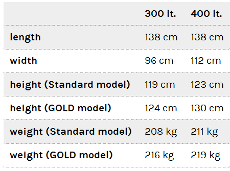 - 300 and 400lt. main tank in polyethylene equipped with gratuated level indicator