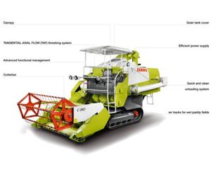 TANGENTIAL AXIAL FLOW (TAF) is unequalled for harvesting versatility - wheat, rice, maize, basmati, sunflowers, soybeans, chickpeas, mustard, mung beans, pigeon peas, etc. Uniform weight distribution and maximum pulling power thanks to the TERRA TRAC system High-quality fibre canopy for maximum operator comfort. Discharging capacity of 30 l/sec reduces the offloading time. Integrated air compressor allows machine to be cleaned without any additional equipment