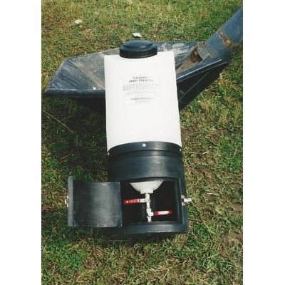 The Classic seed treater straps to the top side of your auger or drill fill about three feet from the bottom intake.  No Holes, No Welding or even wrenches required.