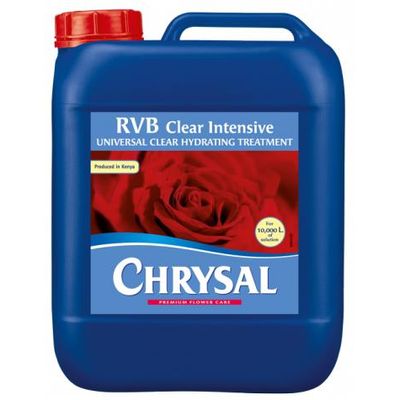 Chrysal RVB Clear Intensive is a clear universal hydrating post-harvest treatment especially for roses and a wide range of other flowers. Chrysal RVB Clear Intensive stimulates the water uptake, thus preventing bent-neck, and improving the flower development and leaf quality. It balances the pH of all water types. Chrysal RVB Clear Intensive is recommended for use by growers so everyone can enjoy their flowers for as long as possible.