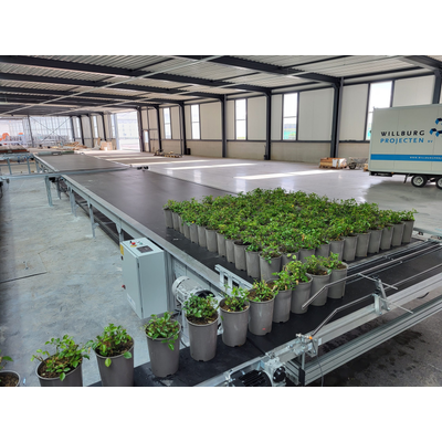 A buffer table with pot destacker is ideal for efficiently reintroducing plants into the production process. With this buffer table, you can effortlessly feed a full load from your forklift into production rows. The destacker features rubber-coated rollers that remove pots row by row from the buffer table. This setup ensures that the buffer table with pot destacker supplies your order processing system with an ample quantity of plants, requiring minimal manual effort.