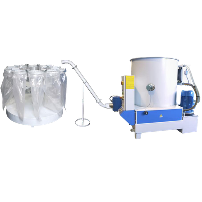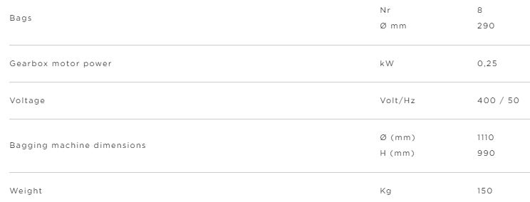 The speed of rotation of the gear motor allows these bags to be loaded in sequence via a connection pipe with support and connector for fixing to the briquetting press extrusion pipe. This product does not feature an electric control panel as it is operated via connection to an electrical socket fitted next to the electric control panel of the briquetting press. This means that start-up of the briquetting press and bagging machine are synchronised.