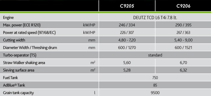 Embodying DEUTZ-FAHR`s many years of experience in harvesting and its ongoing commitment to developing new technologies, processes and machinery, the C9000 Series consists of four models: C9205 TS, C9205 TS B, C9206 TS and C9206 TS B. These machines combine outstanding productivity with extraordinary versatility (for large area applications), an elegant design and incredible functionality, for unparalleled harvesting performance with all types of crop. With powerful engines, superlative fuel consumption and unbeatably low running costs and simple maintenance, the C9000 Series is truly remarkable.