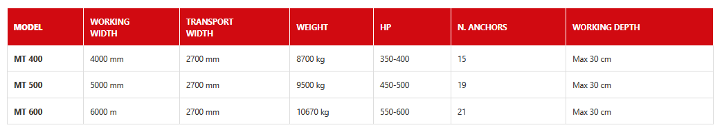 - Three rows of non-stop anchors complete with lateral wings and trashboard, equipped with a non-stop mechanical device with a preload of 900 kg. Their distribution, together with the position after the discs, produces a minor alteration of the soil profile by not leaving large clods on the surface. The maximum operating depth is 30 cm.
