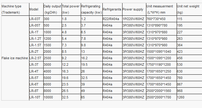 Commercial flake ice machines are widely applied into big supermarket chains, seafood market, Fishing boat ,hotels, food processing and vegetable preservation industries, etc. Ice Thickness:1.8-2.5mm; Fake ice temperature: -7degree Applications. The following standard cooling methods can be customized according to customer needs: air cooling or water cooling. Standard conditions: ambient temperature 25 °C, water supply temperature 15 °C, evaporation temperature -22 °C, condensation temperature 40 °C;. Core Accessories: Bitzer / GEA / Copeland / Danvers. High efficiency ratio(COP=3.0~3.2) high production(≥100%). Can be customized to meet any type of non-standard custom requirements,(Voltage can be customized according to customer needs).