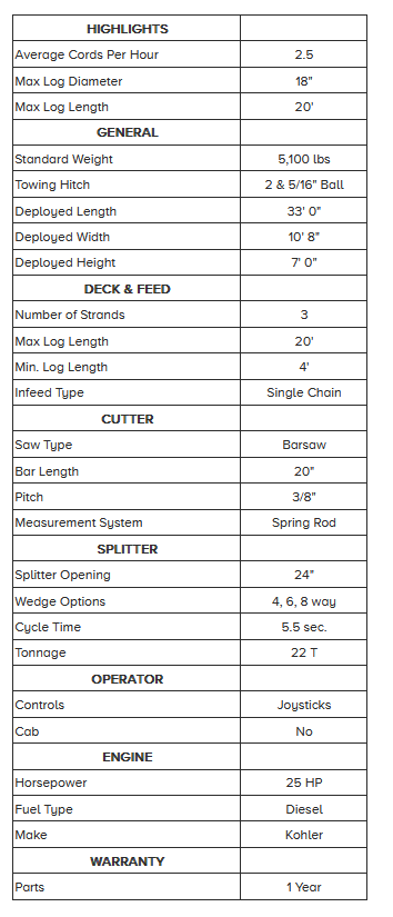 The 20” bar saw is hydraulically powered and cuts logs with the flick of a joystick. With a standard 3/8” pitch chain, this feature keeps costs low and allows you to sharpen and reuse chains for maximum life.