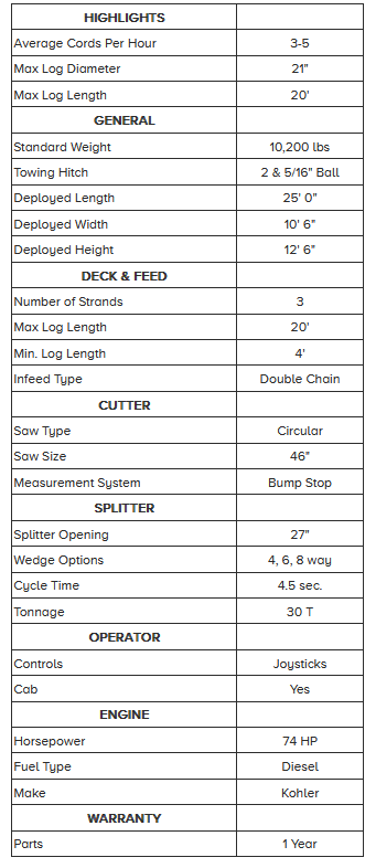 The 2020SS presents a great value, with numerous professional features at a competitive price. Most notably, the 2020SS comes standard with an operator’s cab – a major feature for businesses that run all day, every day. Capable of a 4.5 second cycle time with large hardwood logs, the 2020SS is a professional processor in a small package.