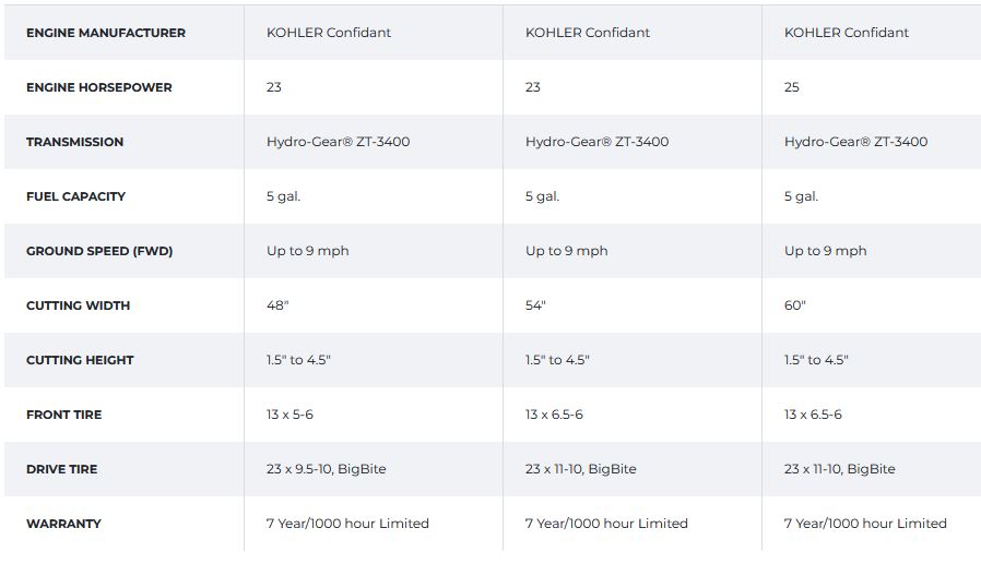 Maximum Performance for the prosumer. Get the productivity you need at the value you need with a commercial grade KOHLER Confidant engine and Hydro Gear`s ZT-3400. Backed by a 7-year (1000 hours) limited warranty, this mower is ready to work.