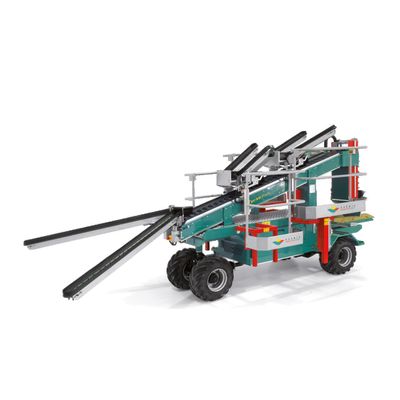 Compact machine for plants with 3.00 m (118 inches) to 3.90 m (153 inches) inter-row and maximum height of 3.60 m (141 inches) of the plant. The rich standard equipment and a complete range of accessories allow the customization of the machine according to the needs of modern fruit farmers. Equipped with a reliable 3-cylinder diesel engine (stage V) that allows low fuel consumption and emissions according to the latest environmental regulation. The 4 side platforms (1.25 x 0.36 m / 49 x 14 inches rear platforms – 0.80 x 0.36 m / 31 x 14 inches front platforms) allow 3 levels of harvesting in a very compact machine. Up to six people can work easily without impediments while guaranteeing maximum ergonomics. Optionally it is possible to choose the new automatic trailer CP04 or, in some special conditions, the new manual bin-trailer CPM. Through the complete range of accessories, Tecnofruit becomes a multipurpose machine that can be used during all seasons.