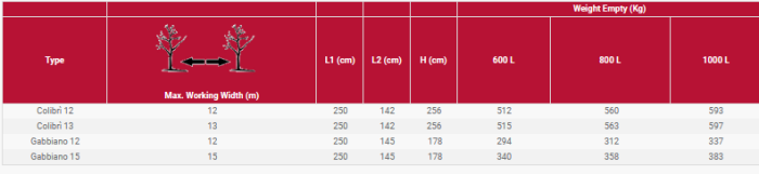 Hot dip galvanized frame. The polyethylene tank internally is highly smooth, this avoids deposits and encrustations. Suction filter with connection for tank loading. Total emptying valve. Safe ladder with handles and pedestal. The boom lifting system is stabilized thanks to a “C” shape section guide. Mounts Colibrì booms (12 or 13 m) and Gabbiano booms (12 or 15 m).