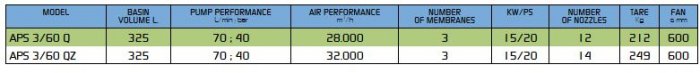 Galvanized frame and fan frame. Tank in polyethylene (325 l) with large lid. Rotating premixer. Hydraulic injection agitator. Triple diaphragm pump 70 l/min (40 bar) aluminium. Integrated circuit cleaning tank (35 l) and hand cleaning tank (15 l). Suction and pressure filter. Cardan shaft T20 Comer.
