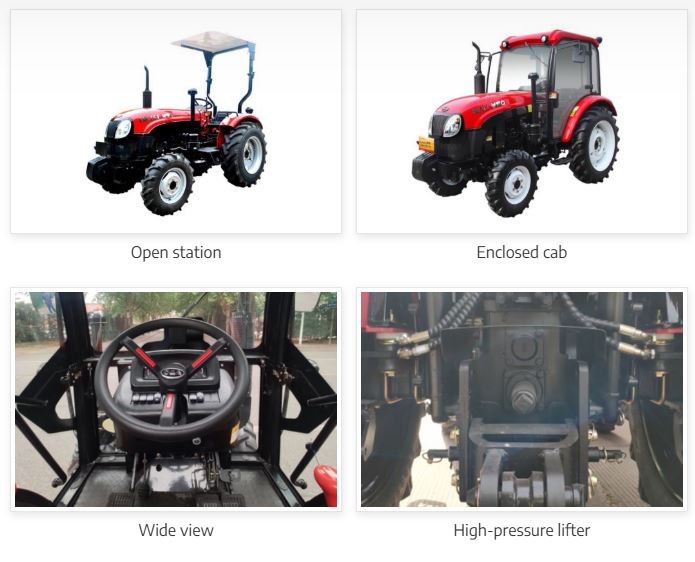 The series of tractors are designed with a nice-looking appearance and a compact structure to suit field chores and transportation work. The naturally aspirated 4-cylinder diesel engine produces high horsepower with low fuel consumption. 8F/4R gears with side shift lever enable easy and convenient operation. The final transmission adopts a planetary gear reducer and it is load-balanced and long-lasting. The wet disc brake results in reliable and smooth stop. The hydrostatic steering unit ensures precise control and requires less operator effort. The dual speed PTO meets various farming needs, such as, rotary tillage. We provide optional air brake systems and a high-pressure lifter.